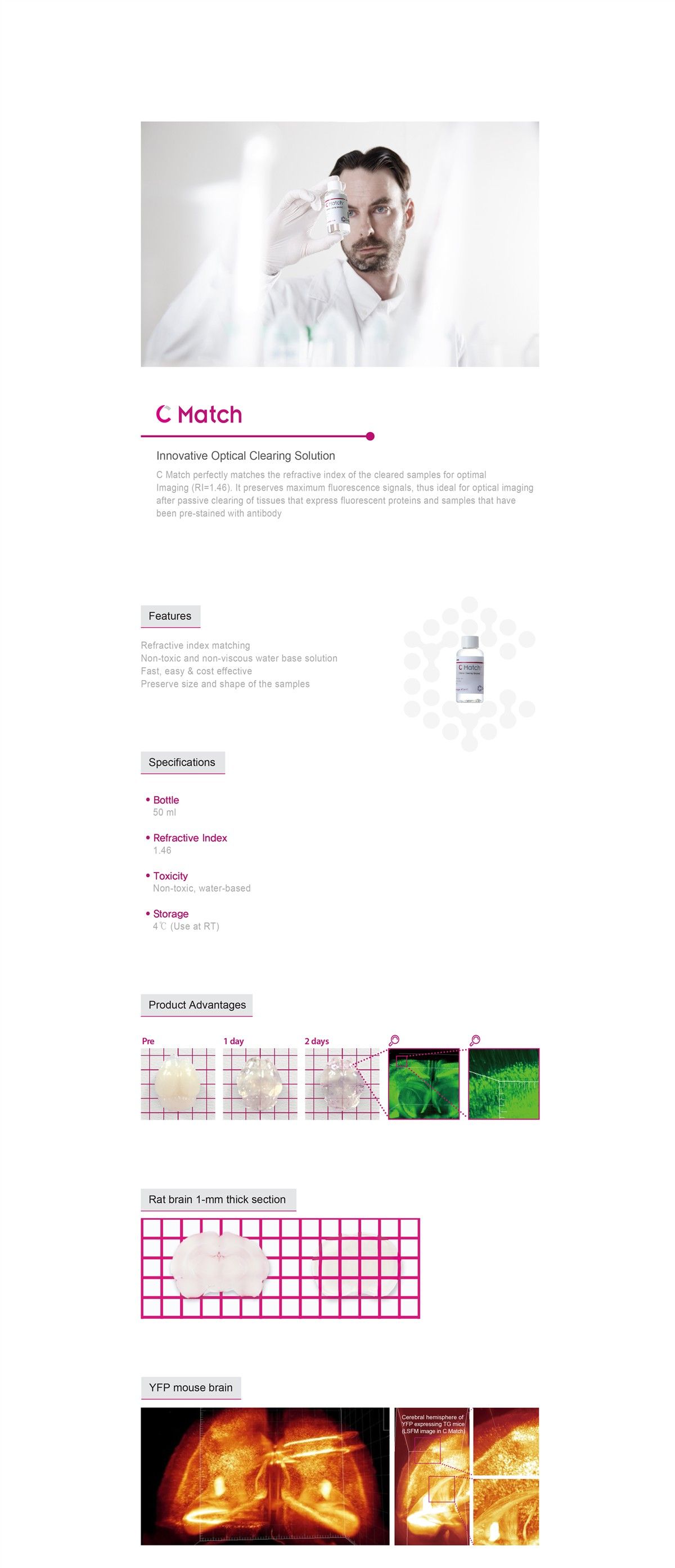 C Match 澄清液 (光学折射率吻合液) 可让样品维持在高品质影像撷取的状态,并且有 CLARITY 样品之折射率 ( RI-index: 1.46 ), 放入后让澄清样品更加透明,可保 存完整荧光蛋白表现并为无毒水性配方。非 CLARITY 处理后之斑马鱼、胚胎 及昆虫样品,可直接放入,一样具有透明化效果.详细介绍