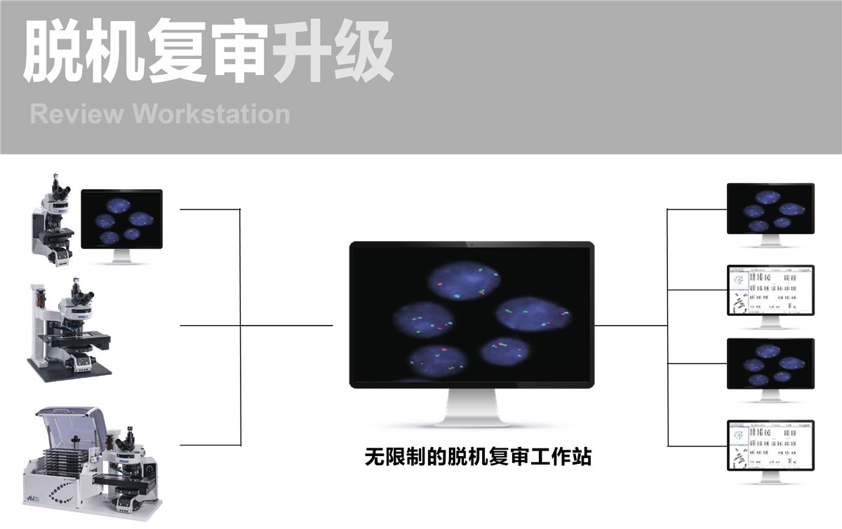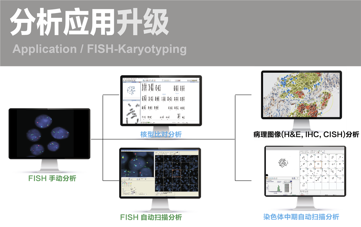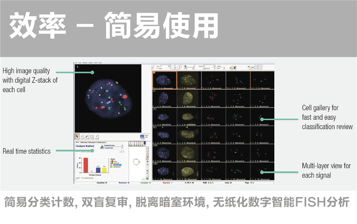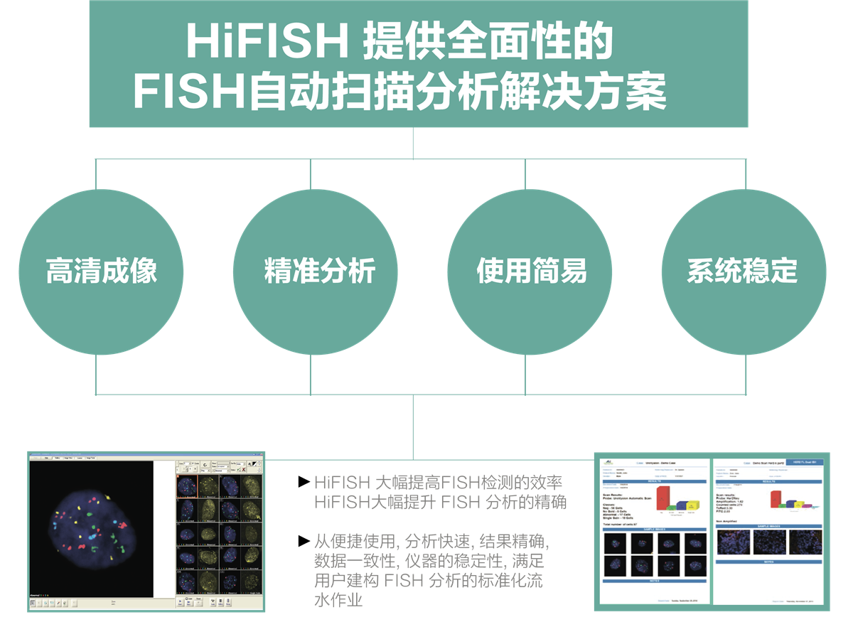 HiFISH图像分析工作站具有先进人工智能的荧光图像处理与精确分析功能, 从高解析的成像, 到无纸化的简易流畅的数字化 FISH 分析, 强大的运算功能, 可以提供精确性的自动分类, 也易于修改和评审, 数据集成至 LIS, 便于查看, 管理, 分享, 远程复审。