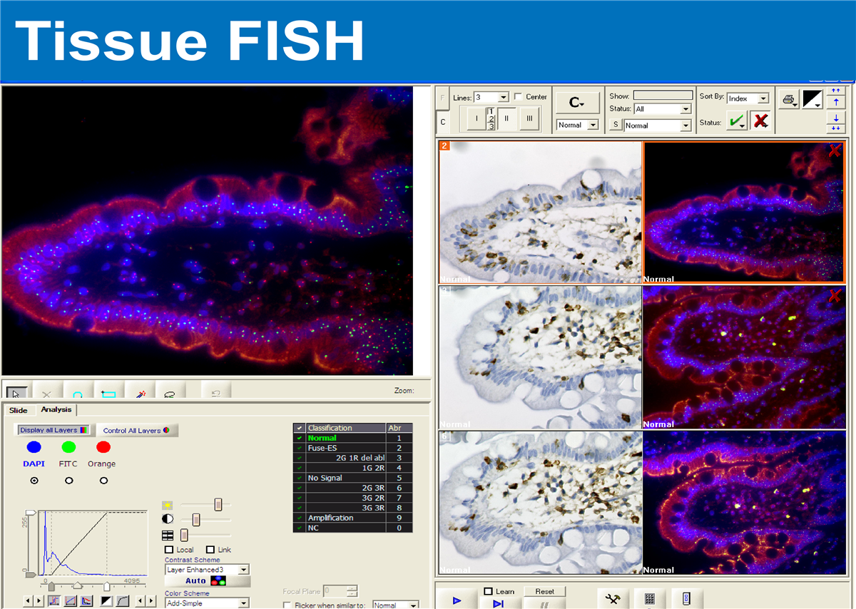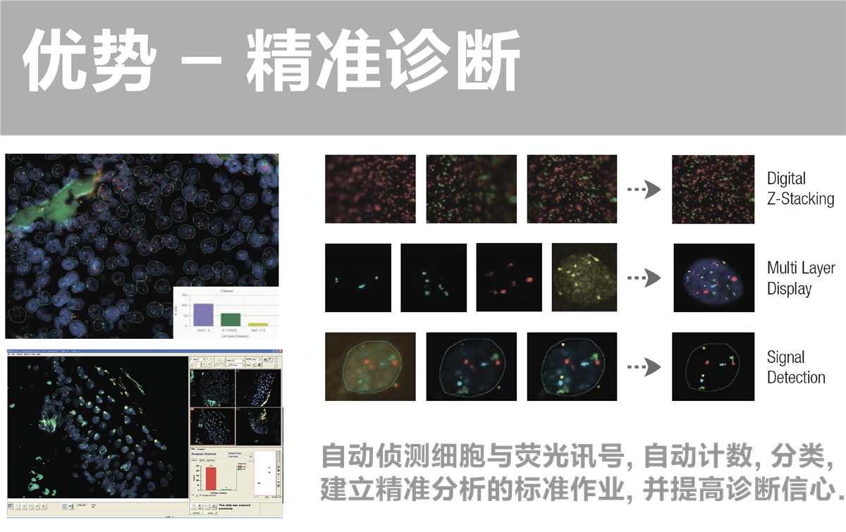 - 精准的定量分析每一个FISH 讯号, 每一个细胞, 包括荧光讯号的强度与型态.