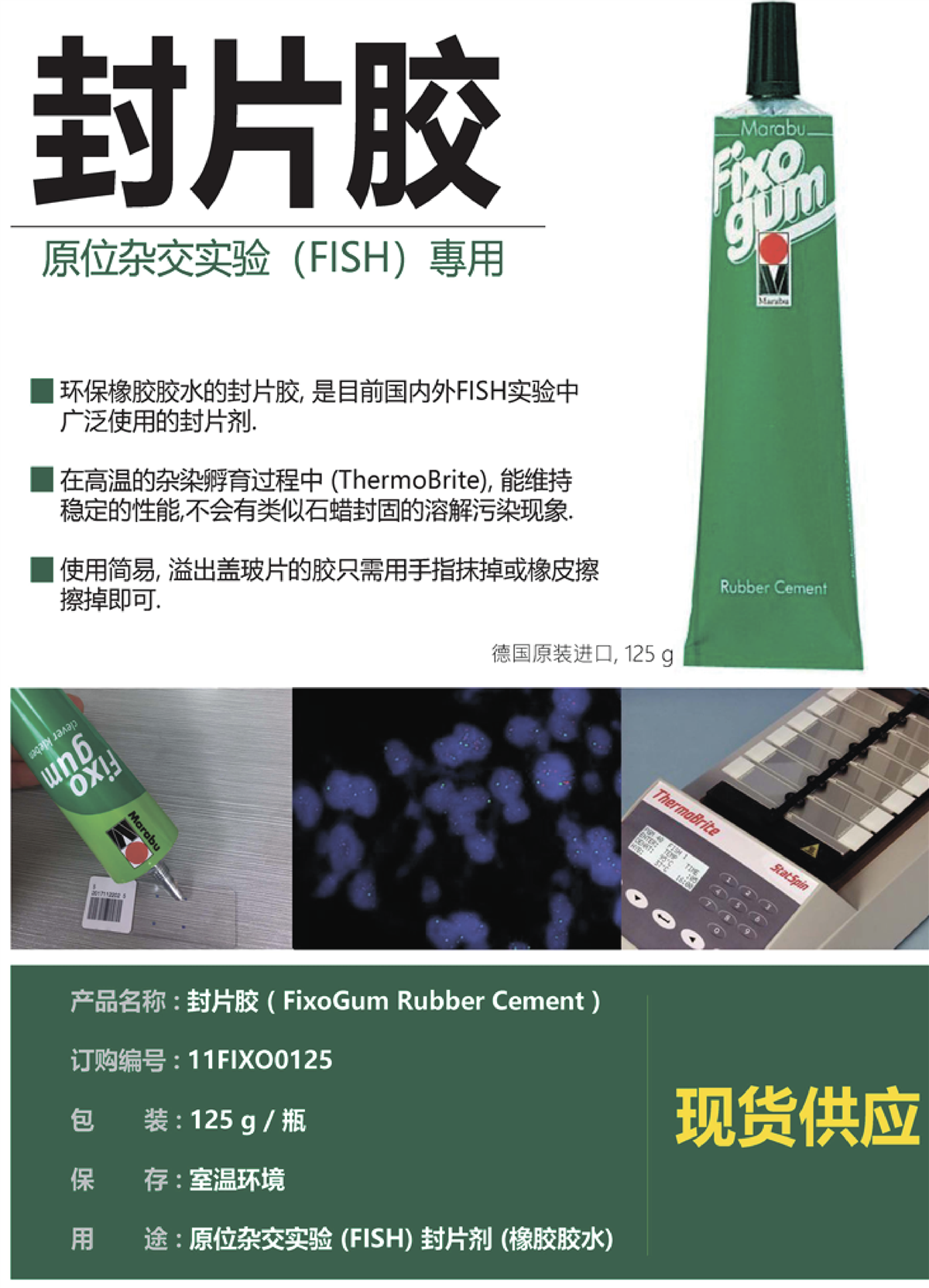Fixogum (125 gram包装) 是环保橡胶胶水的封片胶, 是目前国内外FISH实验中广泛使用的封片剂. 在高温的杂染孵育过程中 (ThermoBrite), 能维持稳定的性能,不会有类似石蜡封固的溶解污染现象. Fixogum 具有快干型黏胶的特性, 透光性佳, 适宜显微镜检查与荧光成像应用.