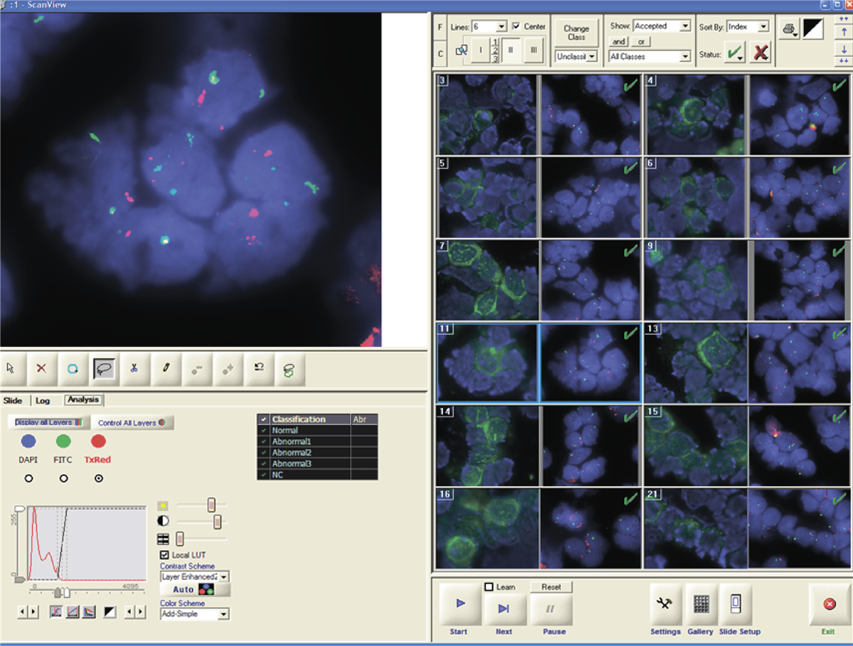 FISH 技术人员可根据 FISH 荧光信号模式对细胞进行计数和分类。 技术人员无须反复离开目视显微镜, 同时进行目视与计数. 也无需使用笔纸记录. mCounter 的结果会自动记录在 病例数据管理器 (CDM) 管理系统,并集成到报告和实验室信息管理系统 (LIS) 。 收集到的统计数据以图形和表格格式供用户使用。