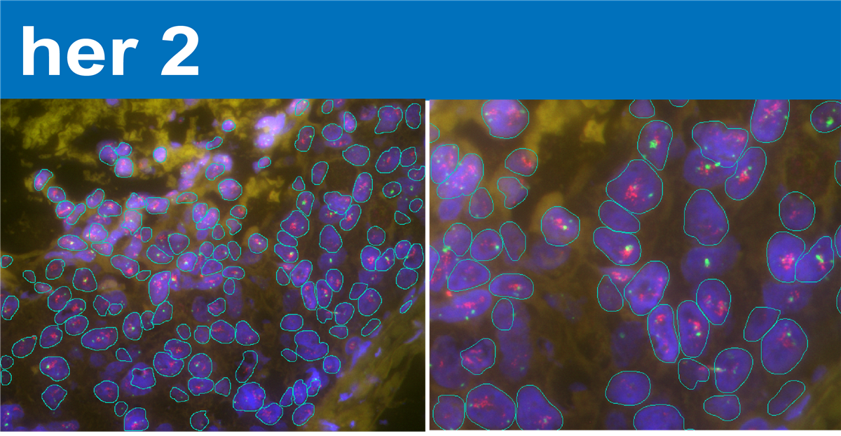 使用FISH的优点在于用传统的分子生物学方法抽取肿瘤组织的DNA或RNA作南方或北方点墨法的时候,很难避免受到邻近肿瘤组织的间质组织之干扰,会稀释肿瘤组织所特有的DNA表现,而FISH可以避免这个问题。FISH在荧光显微镜下可以确认出肿瘤所在的位置,以PathVysion test来说,它会把HER-2基因部位呈现橘色荧光亮点,它也会将第17对染色体的中心粒(centromere)呈现绿色亮点,我们只要比对橘色及绿色亮点的数目,若橘点/绿点大于2,就表示有HER2基因过度表现(因正常细胞之橘点数目比绿点数目比值小于2)。