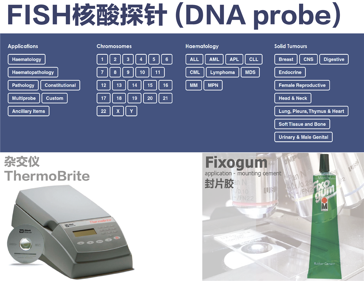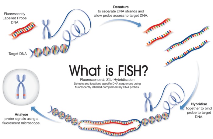 荧光原位杂交(fluorescence in situ hybridization),简称FISH。基本原理:应用荧光染料标记探针DNA,变性成单链后与变性后的染色体或细胞核靶DNA按照碱基互补的原则进行杂交,形成可被检测的杂交双链核酸,在荧光显微镜下观察并记录结果。