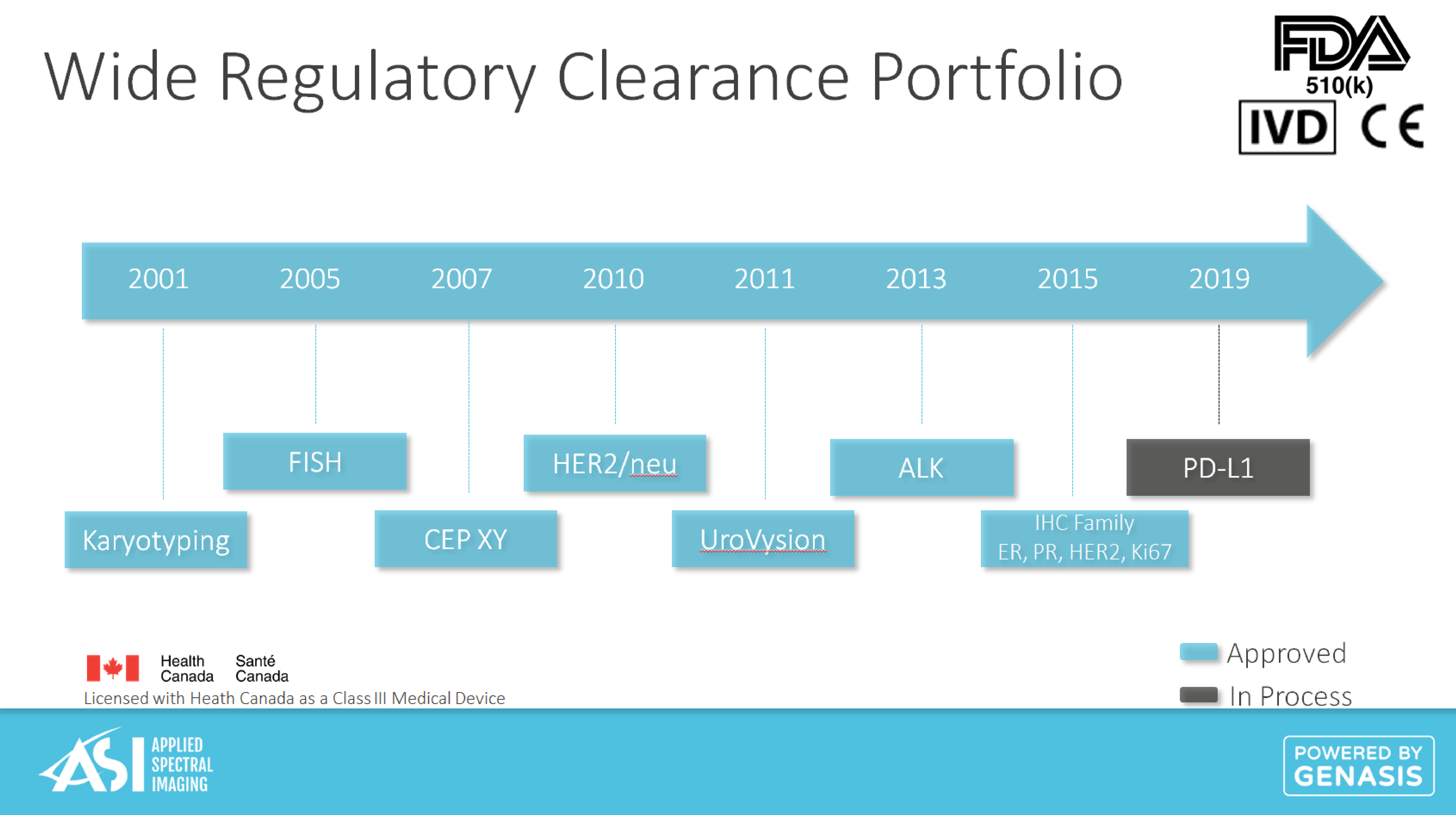 LabCorp (美国) 诊断实验室,包括在中国的实验室都采用ASI 产品做为其核心的染色体核型比对分析工具。LabCorp. 评估全球所有相关染色体核型比对分析设备, 从染色体核型辨识精确度与速率, 处理复杂染色体的速度与方法, 报告生成的速率, 工作流程的顺畅度与速度, 数据管控功能的严谨与网络运作的多任务协作, 投资效益分析, 综合多项考核因素, ASI被评为理想的工具 正因如此, 一次性安装在美国数量达到数百套, 分散在全美各地医院与实验室。