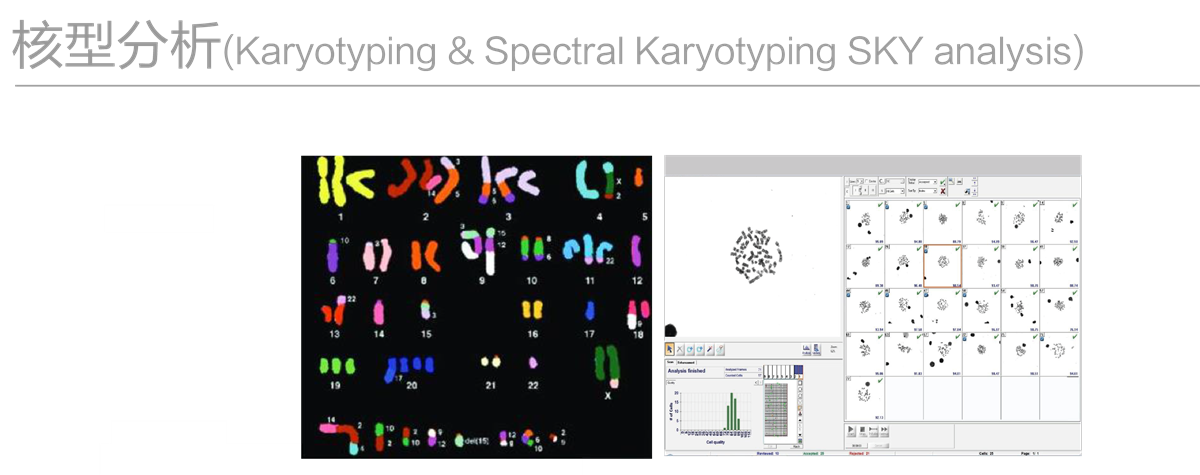 开展 HiSKY , SpectralFISH医检技术, 可以提供细胞遗传学的进一步判定, 同时, 在肿瘤染色体的判定, 也具有一定效益的帮助.