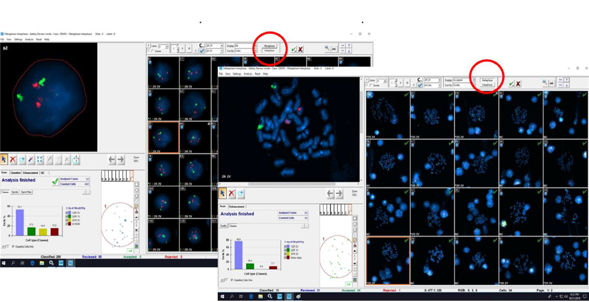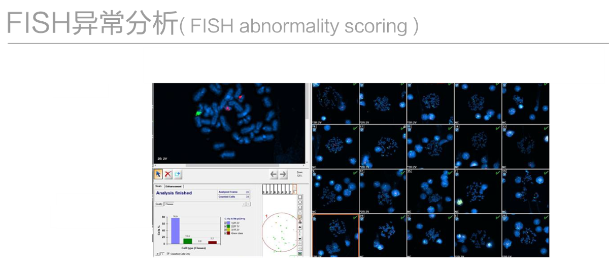 软件提供无人值守的扫描和100x捕获染色体中期的功能,从而可以准确地进行人工检查, 检测每个染色体中期内可能存在的双着丝粒,环状或碎片染色体。