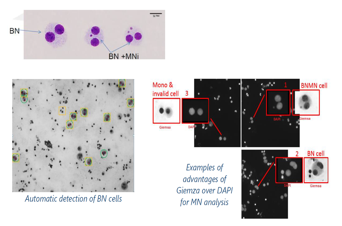 ASI的MN得分可利用Giemsa染色剂以全自动和高精度测试电离辐射。 该软件根据细胞核和微核含量对细胞进行计数和分类。