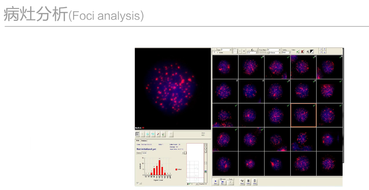 研究人员通常评估染色体的端粒与细胞异常型态的识别来做病灶分析 (FOCI) 的解决方案. 基本上必须使用自动荧光显微镜执行全自动的XY-Z 扫描所有样品区。然后进一步在100x 高倍率物镜下, 做 Z-stack 与 3D 数据的搜集, 以便对每一个细胞单元做3D审阅.